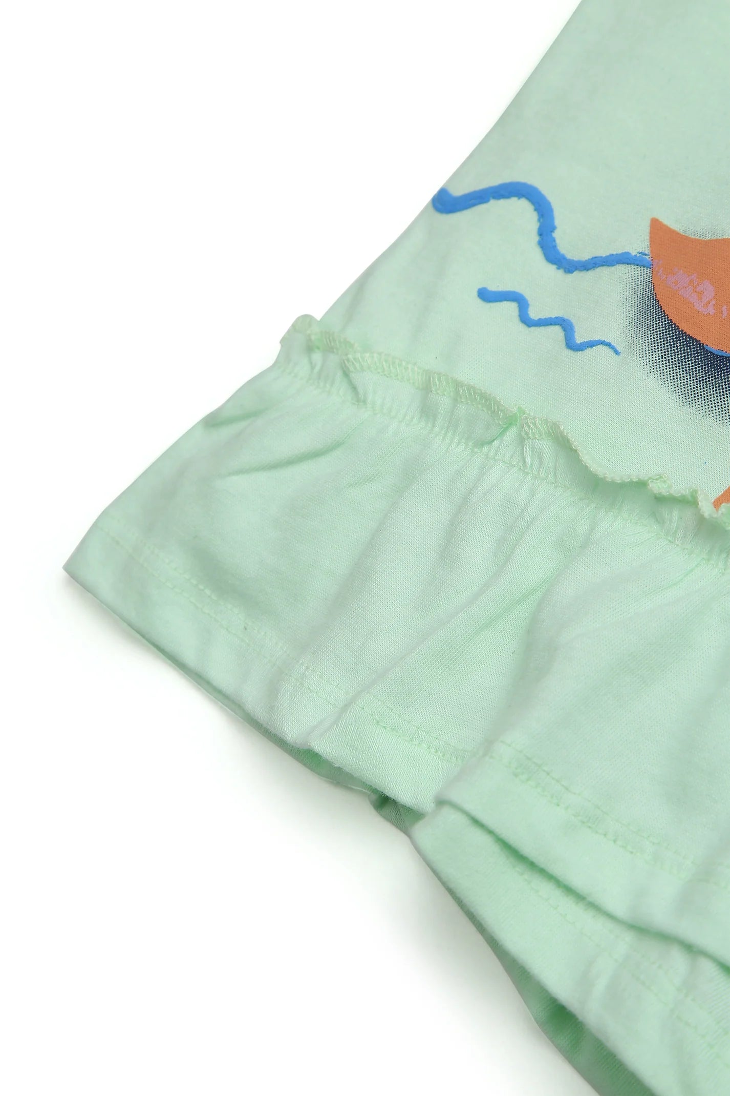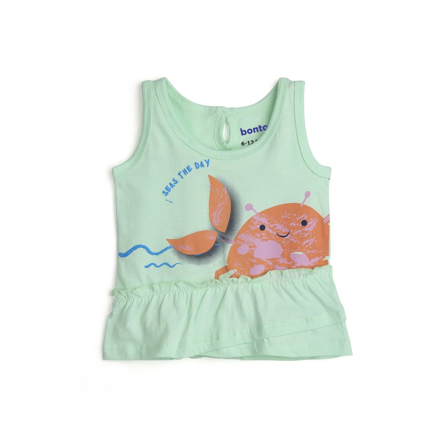 This cute sleeveless baby top features a cheerful crab graphic with the playful text ""Seas the Day"" on a light mint green background. The top is made from soft, breathable cotton and has a flared ruffle hem, adding extra charm. A back button closure ensures easy dressing for your little one.