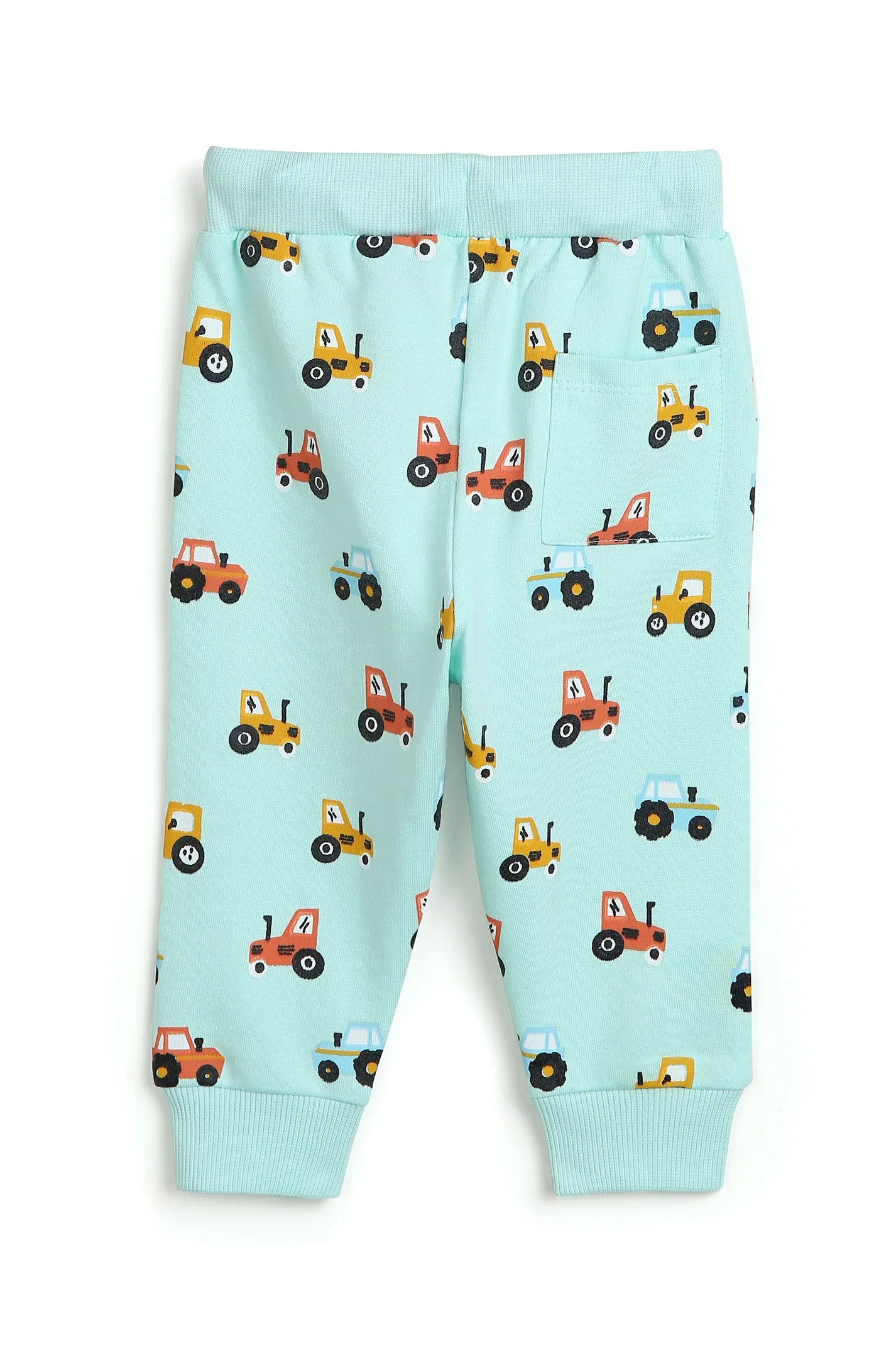 These cute baby joggers feature an all-over tractor print on a light aqua background, perfect for adding a fun touch to your little one’s wardrobe. Made from soft, breathable cotton, they provide comfort for all-day play. The elastic waistband with a drawstring ensures a secure fit, while the cuffed ankles add extra coziness.