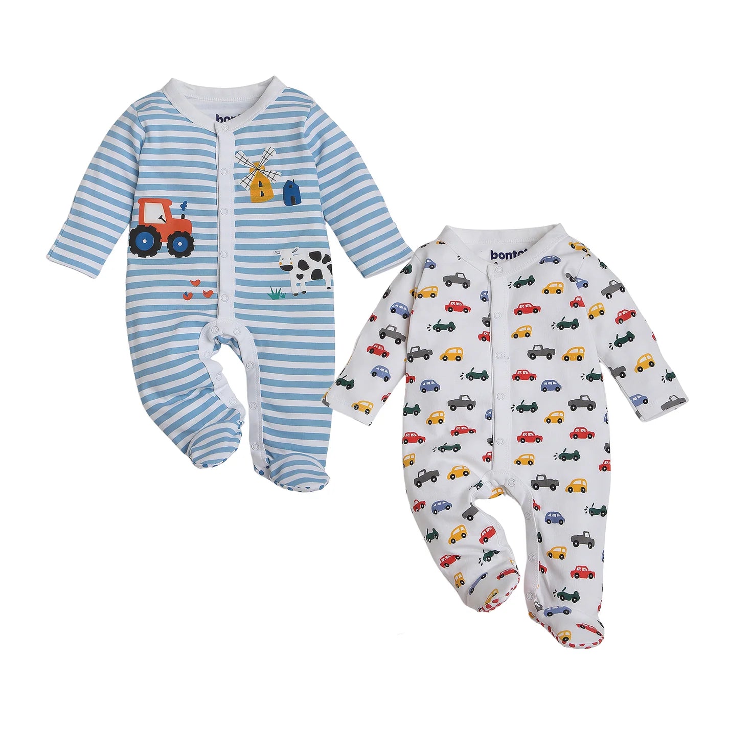 Get your little one ready for fun-filled dreams with the Bontots Organic Cotton Baby Sleepsuit Combo, featuring two delightful prints—"Farmyard Fun" with tractors, cows, and windmills (Blue Stripes) and "Car print" with colorful cars and bikes (White).