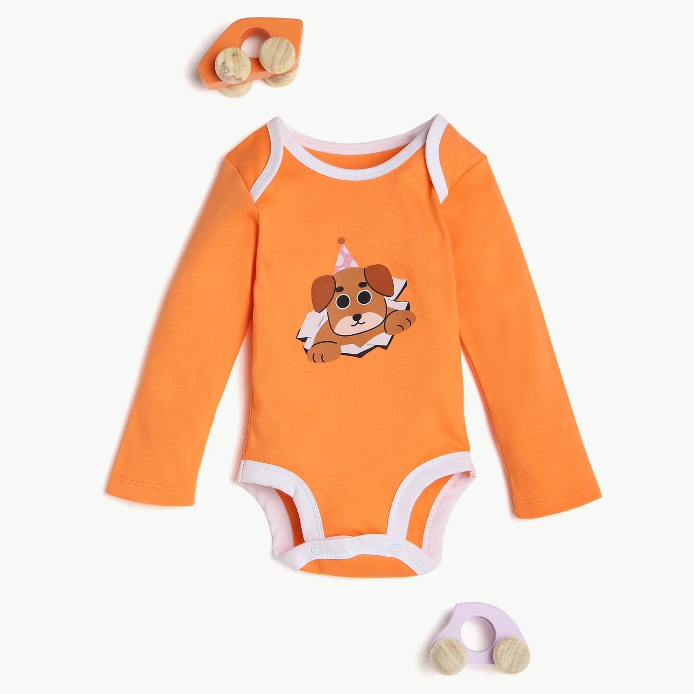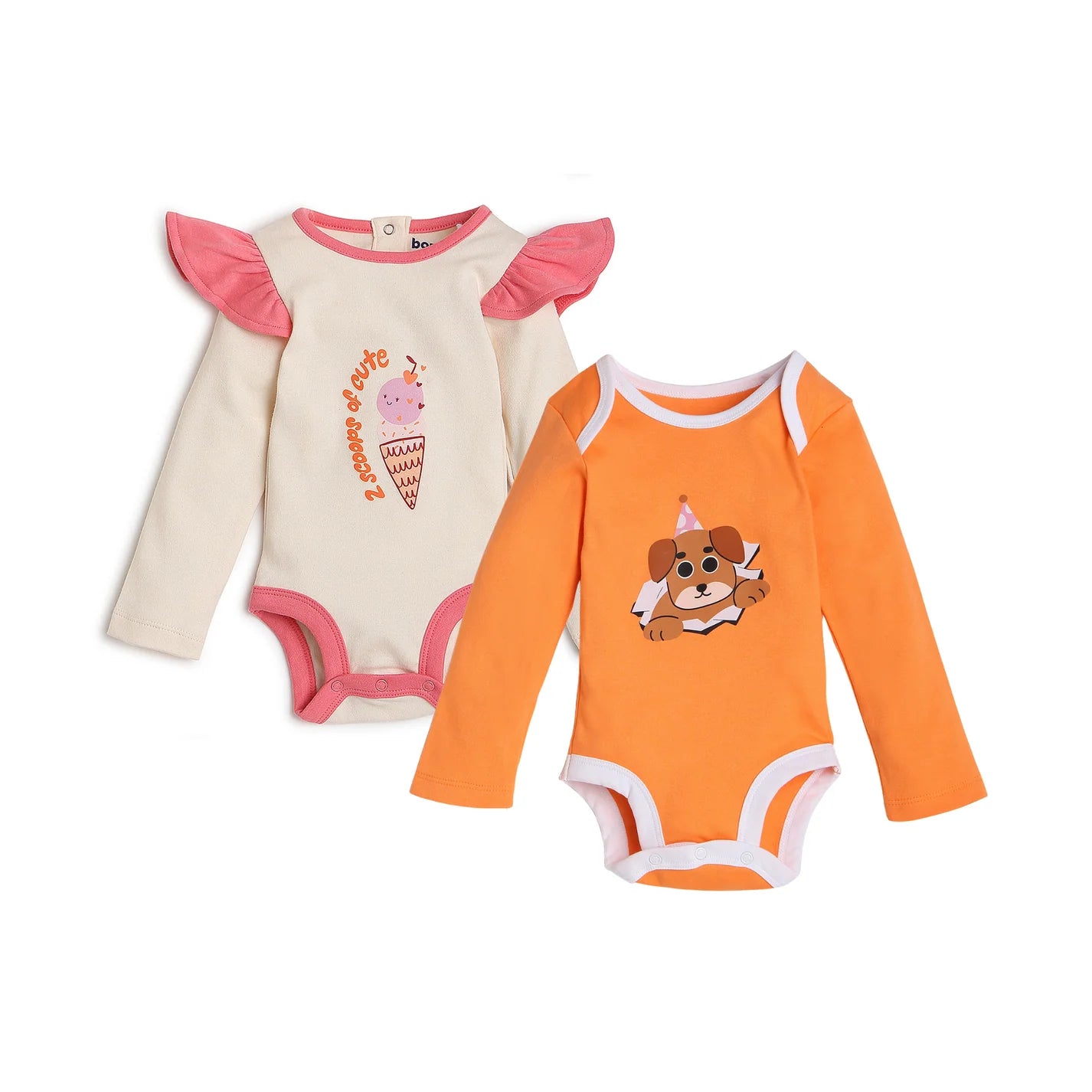 Dress your little one in adorable style and all-day comfort with the Bontots Organic Cotton Baby Bodysuit Combo, featuring two irresistibly cute designs—"Party Pup" with a playful puppy peeking through (Orange) and "Two Scoops of Cute" with a delightful ice cream print and flutter sleeves (Cream & Pink).