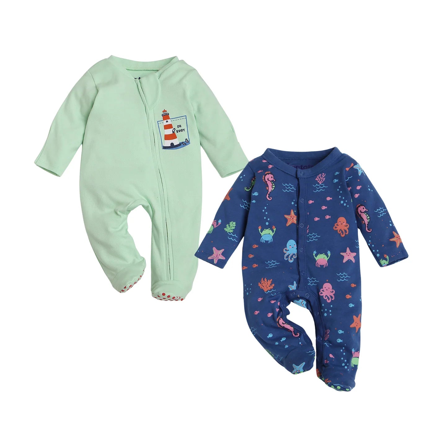 Wrap your little one in the softest embrace with the Bontots Organic Cotton Baby Sleepsuit Combo, featuring two irresistibly cute designs— Lighthouse Print (Mint Green) and "Under the Sea" Ocean Adventure Print (Navy).