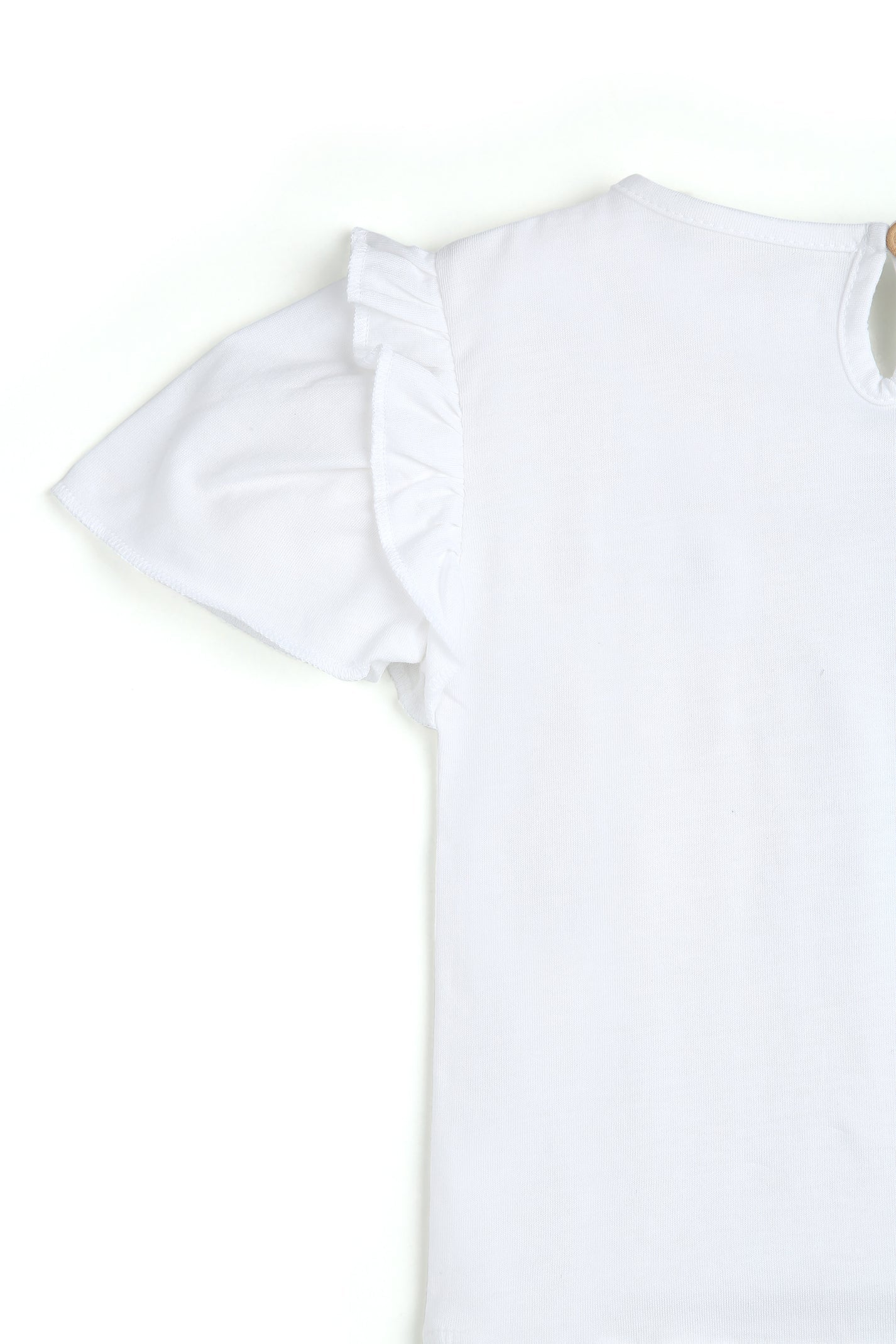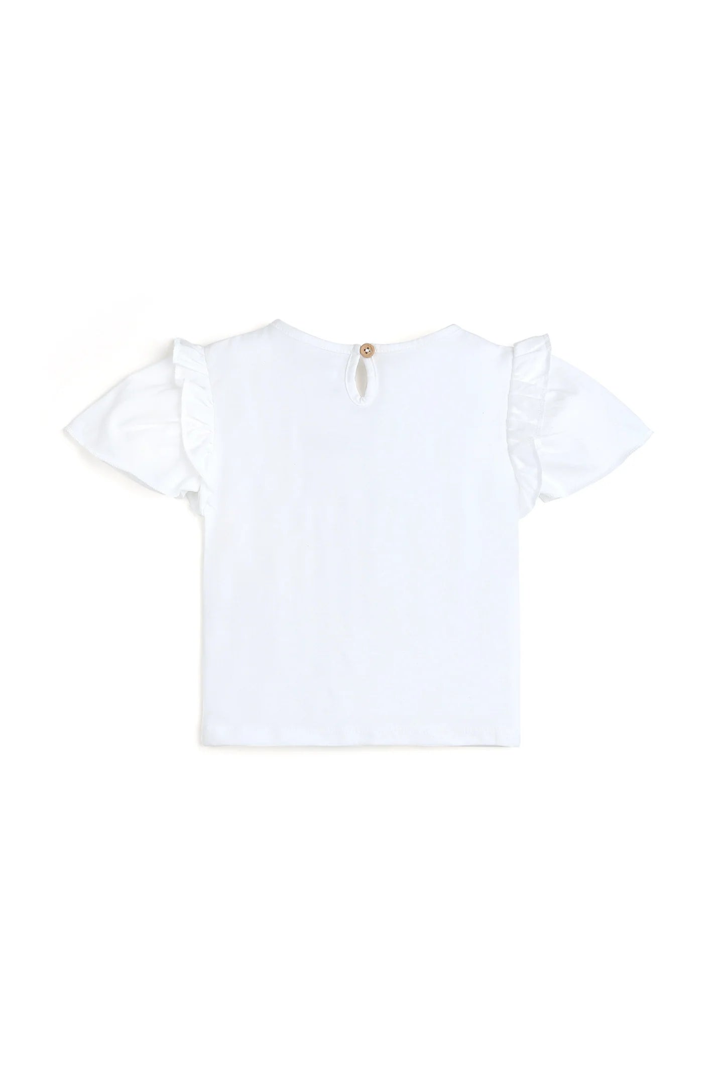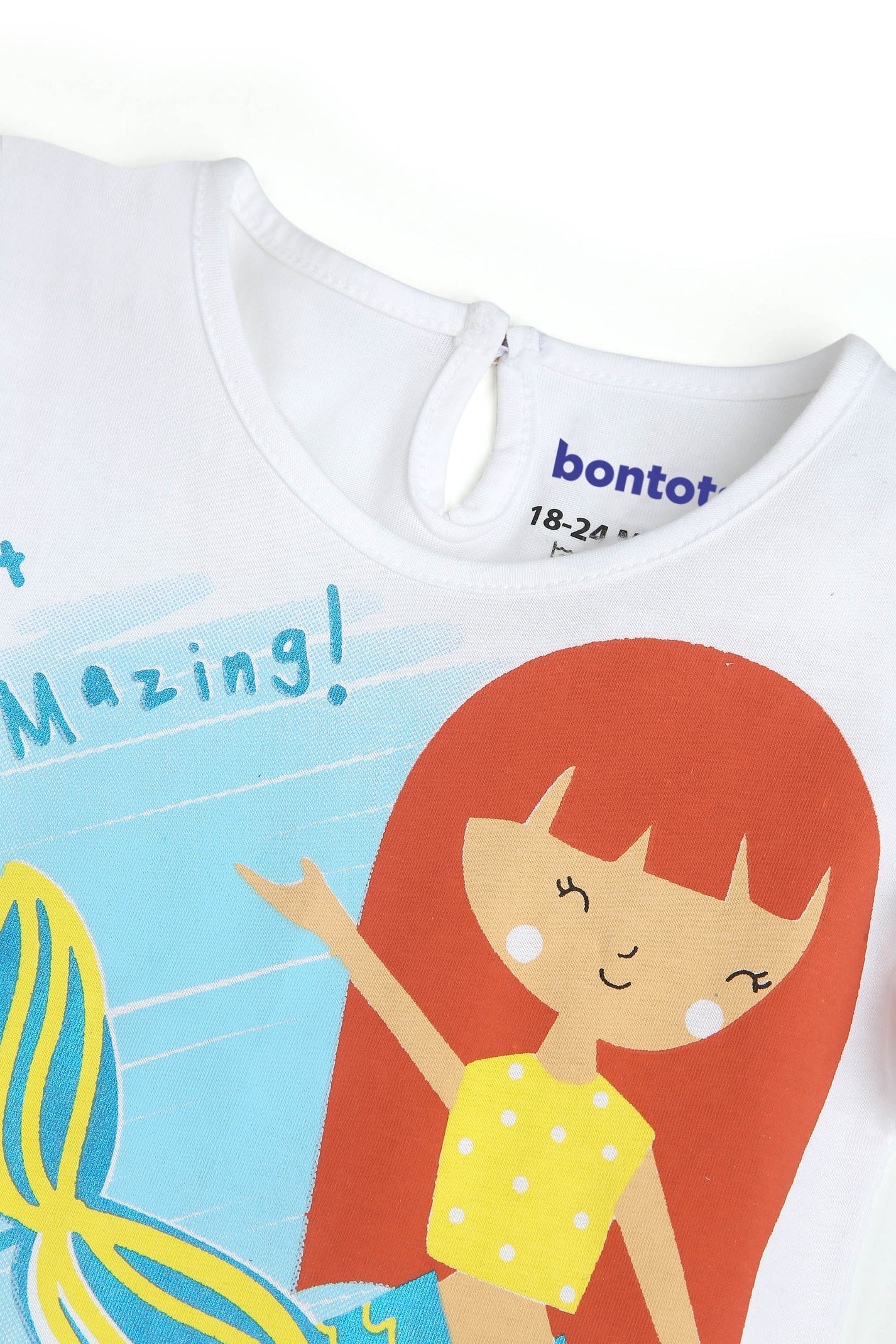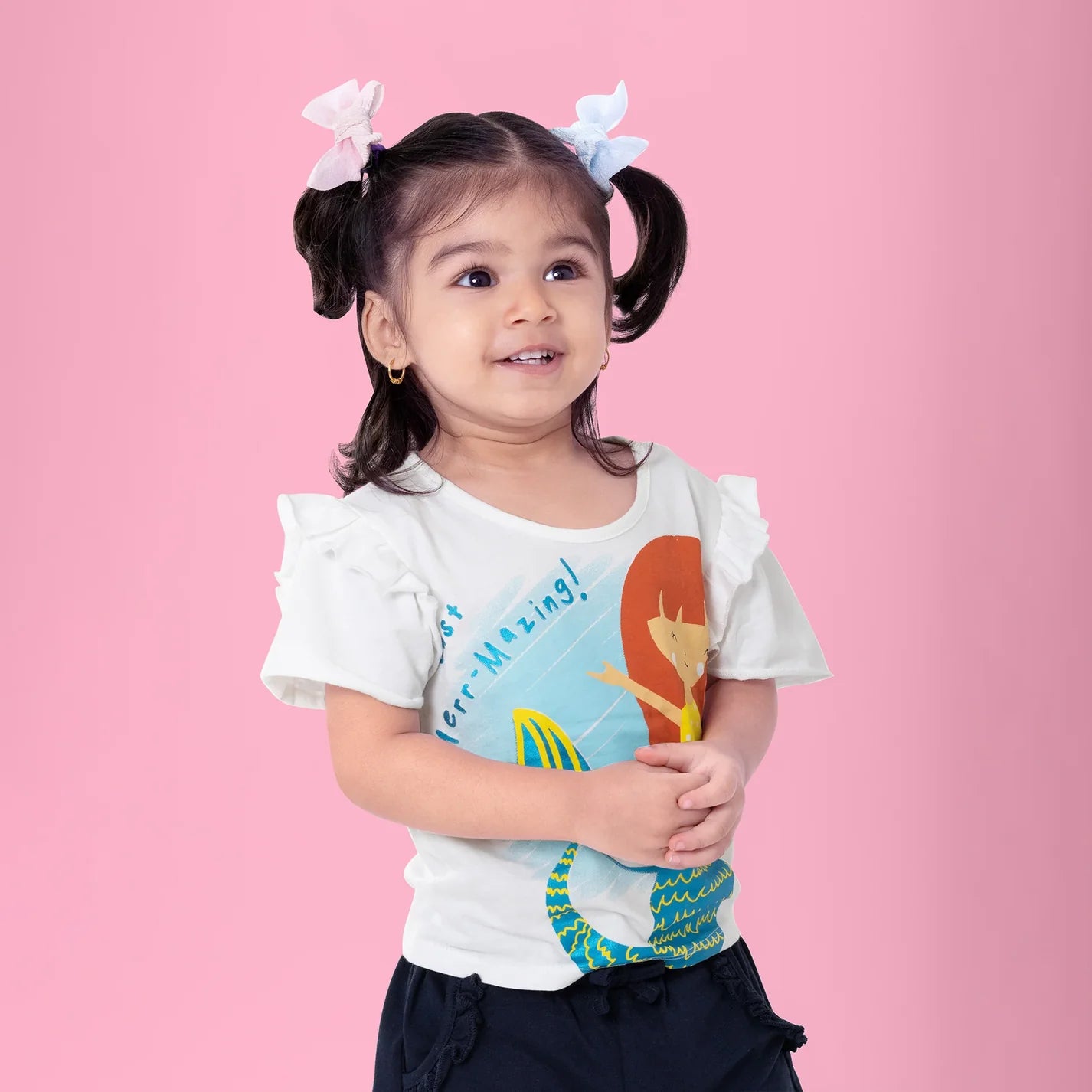 This delightful short-sleeve baby top features a charming mermaid graphic with the playful text ""Just Mer-Mazing!"" on a crisp white background. The ruffle sleeves add an extra touch of cuteness. Made from 100% organic cotton, it's soft and gentle on your little one's skin. The back button closure ensures easy dressing.