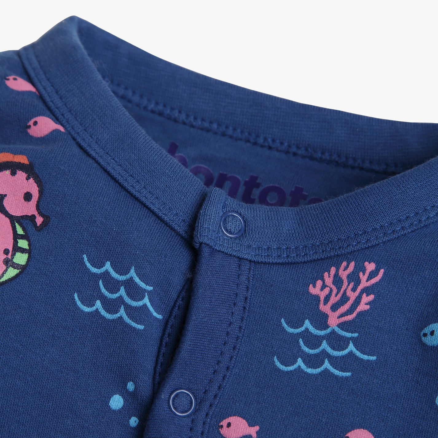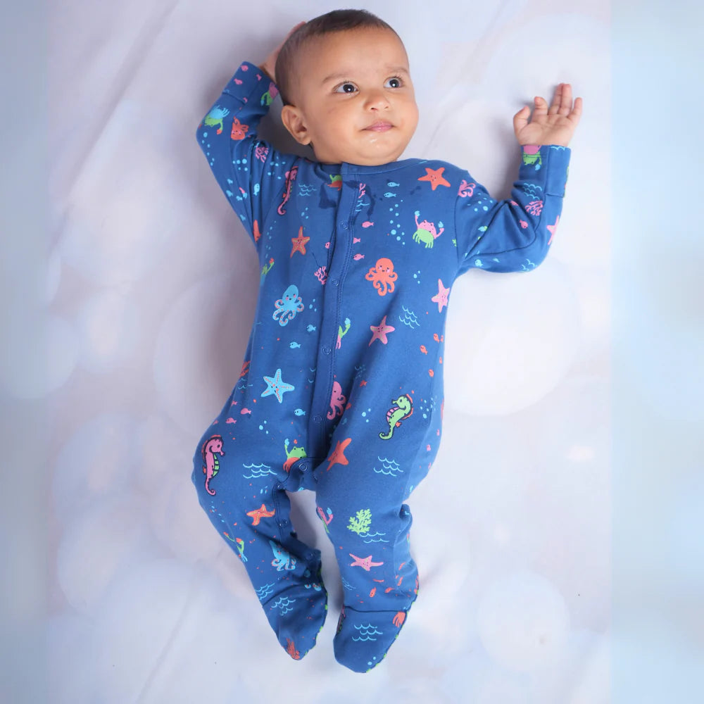 This adorable Baby Romper brings ocean-themed fun to your baby’s wardrobe. With vibrant sea creatures printed on a soft navy background, it’s crafted from breathable cotton to ensure comfort throughout the day. Snap closures along the front make diaper changes a breeze, while the long sleeves keep your little one snug and warm.