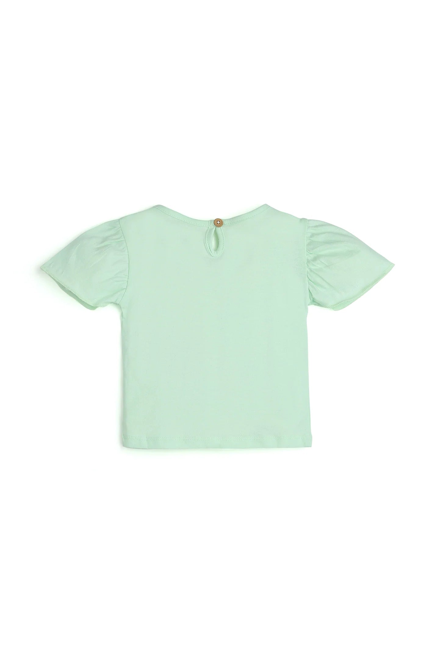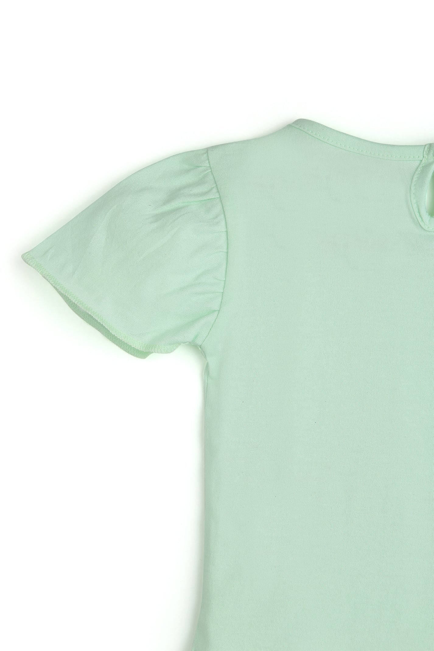 This adorable short-sleeve baby top features a cheerful crab graphic with the fun text "Out of the Sea" on a soft mint green background. Made from breathable cotton, it keeps your little one cool and comfy. The back button closure adds convenience for easy dressing.