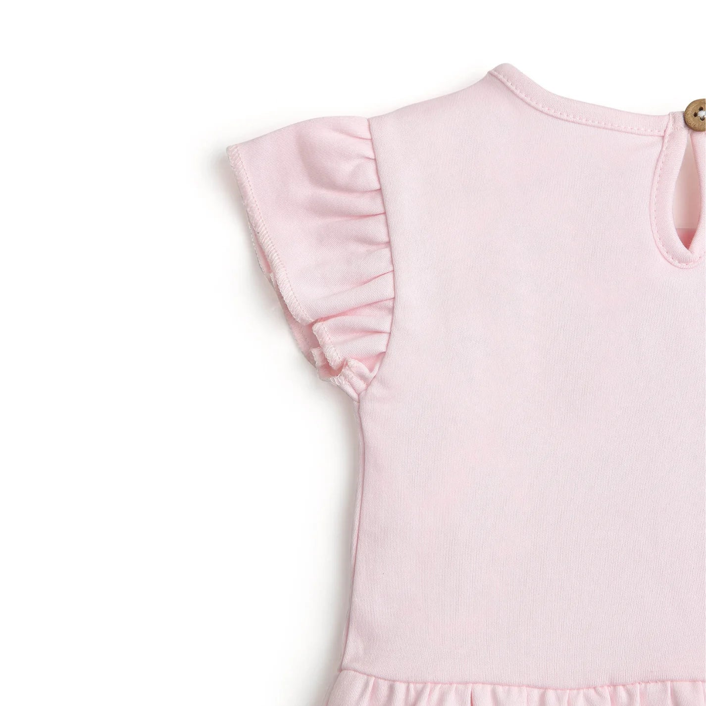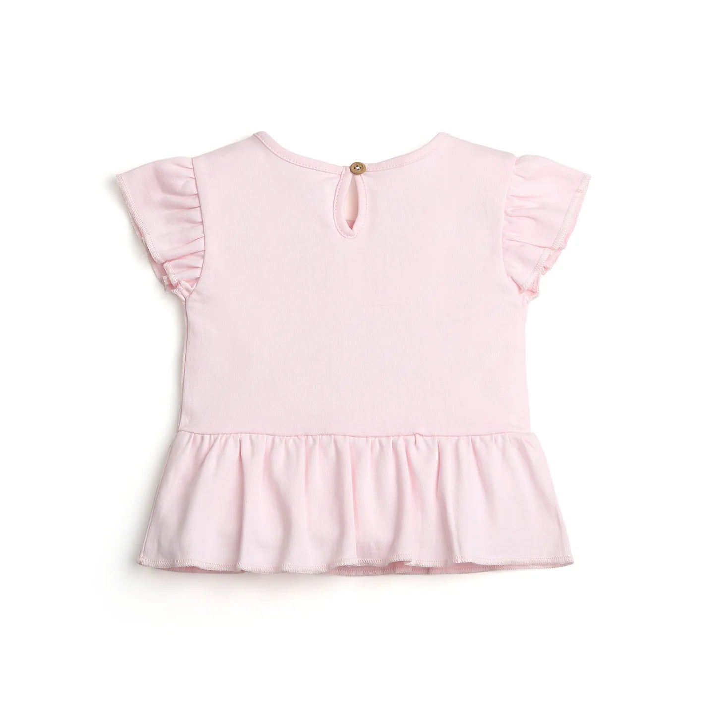 This adorable short-sleeve baby top features a vibrant animal graphic with a giraffe, rhino, and crocodile on a soft pink background. The ruffle sleeves and peplum-style hem add a cute, playful touch. Made from soft, breathable cotton, it’s perfect for all-day comfort. The back button closure makes dressing your little one easy and fuss-free.