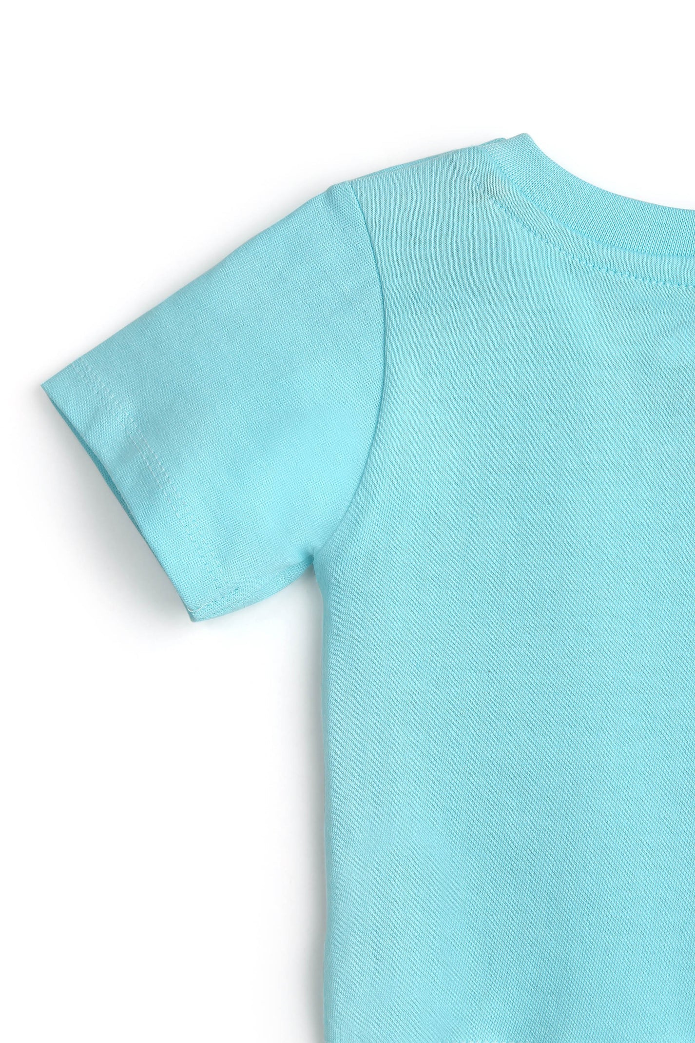This adorable short-sleeve baby top features a fun nautical design with a seagull on a boat and the playful text "Ahoy!" on a bright aqua background. Made from soft, breathable cotton, it’s perfect for keeping your little one comfy. The shoulder snap buttons make dressing quick and easy.