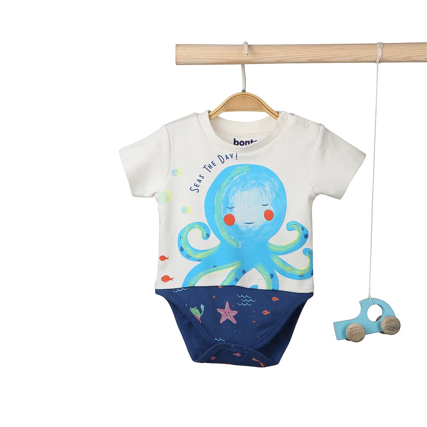 This cute short-sleeve baby romper features an adorable octopus graphic with the fun text "Sea the Day!" on a white background, paired with blue ocean-themed bottoms. Made from soft, breathable cotton, it’s perfect for comfort. Snap closures ensure quick and easy diaper changes.