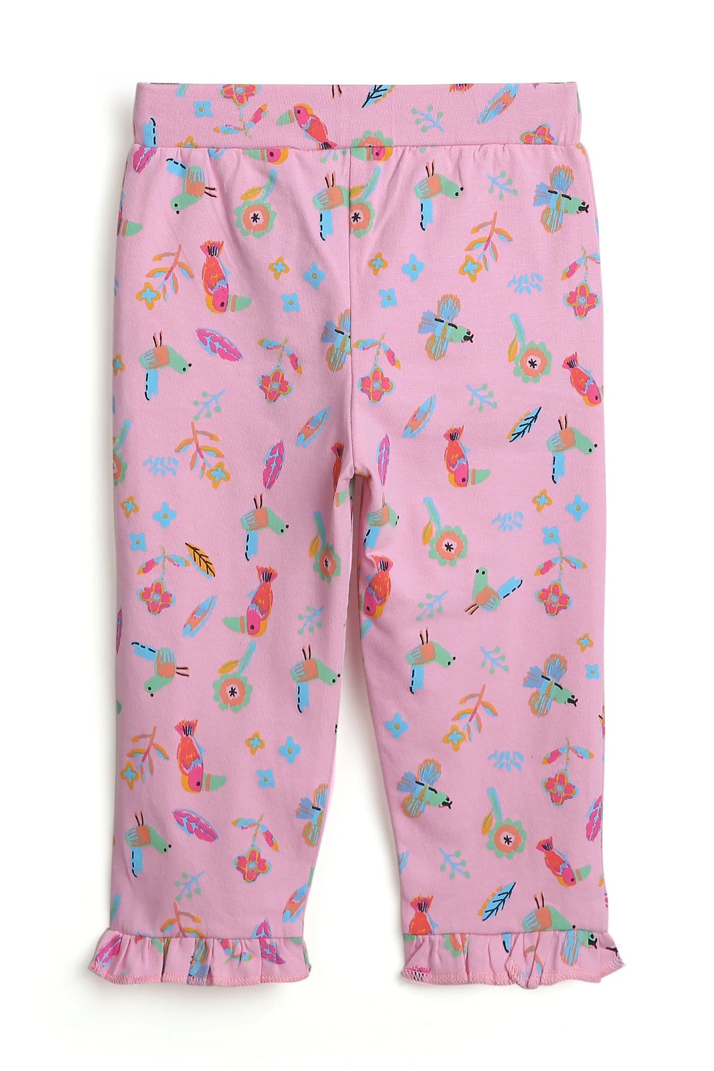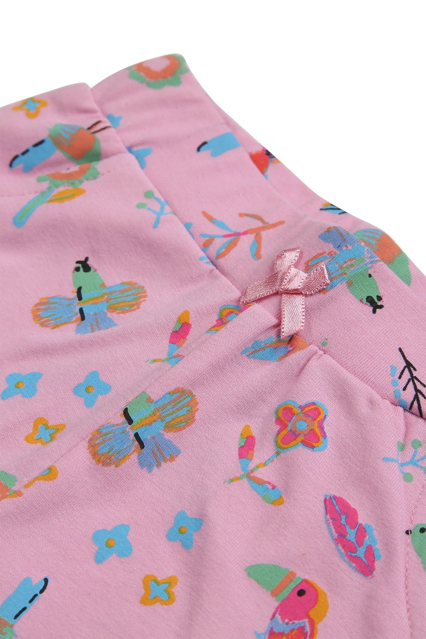 These adorable baby leggings feature a whimsical all-over bird and flower print on a soft pink background, perfect for a playful look. Made from soft, breathable cotton, they provide all-day comfort. The elastic waistband ensures a snug fit, while the ruffle detail at the cuffs adds a sweet touch.