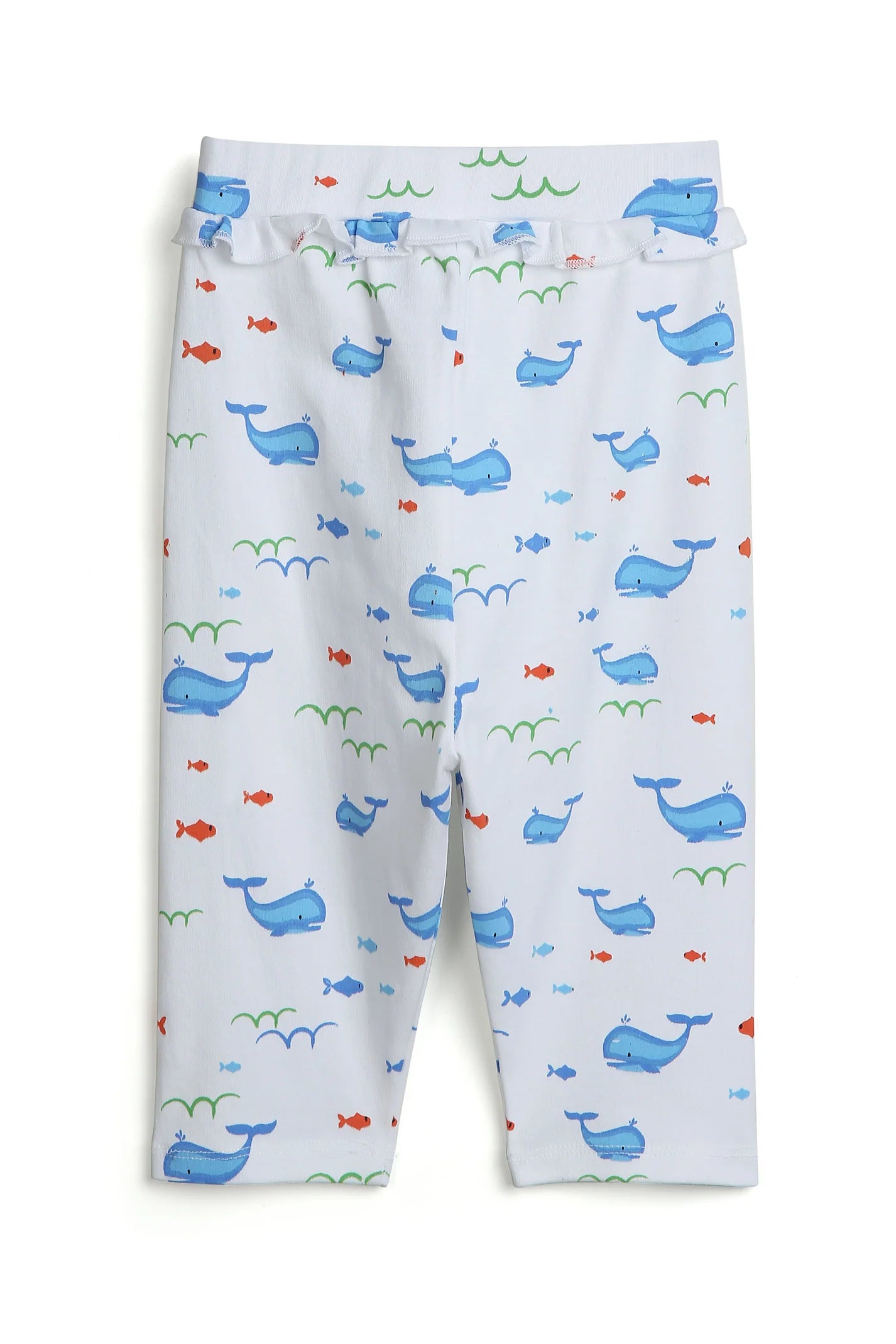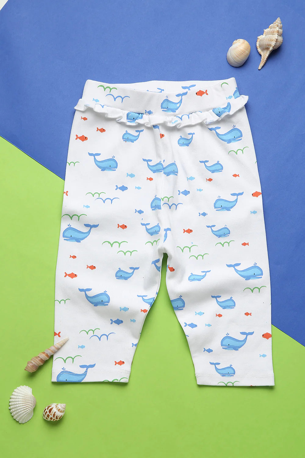 These adorable baby leggings feature a playful all-over whale and fish print on a crisp white background. Made from soft, breathable cotton, they ensure all-day comfort for your little one. The elastic waistband provides a snug, secure fit, while the ruffle detail adds a cute touch.